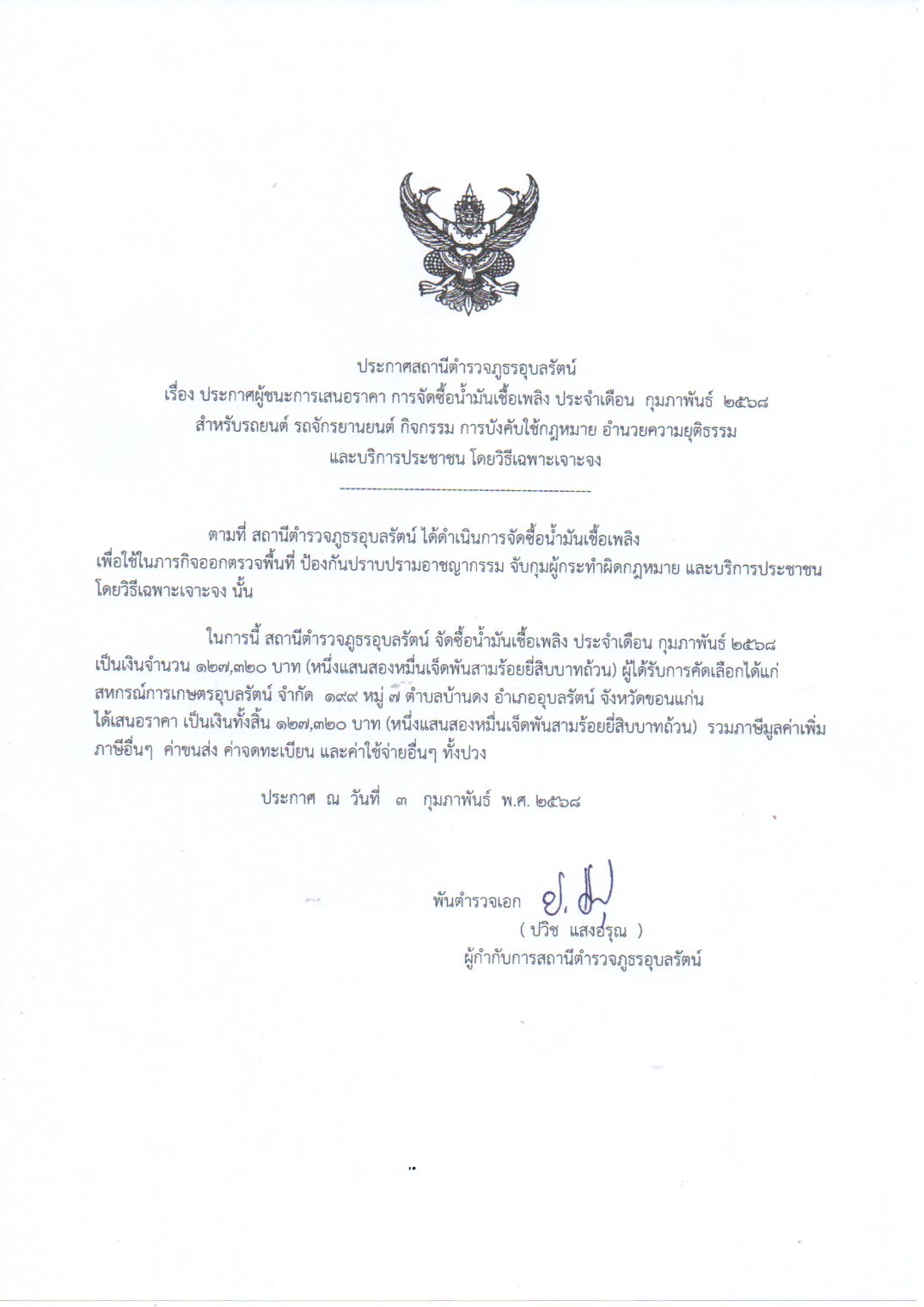 ประกาศผู้ชนะการเสนอราคาน้ำมันเชื้อเพลิง โดยวิธีเฉพาะเจาะจงเดือน กุมภาพันธ์ 2568