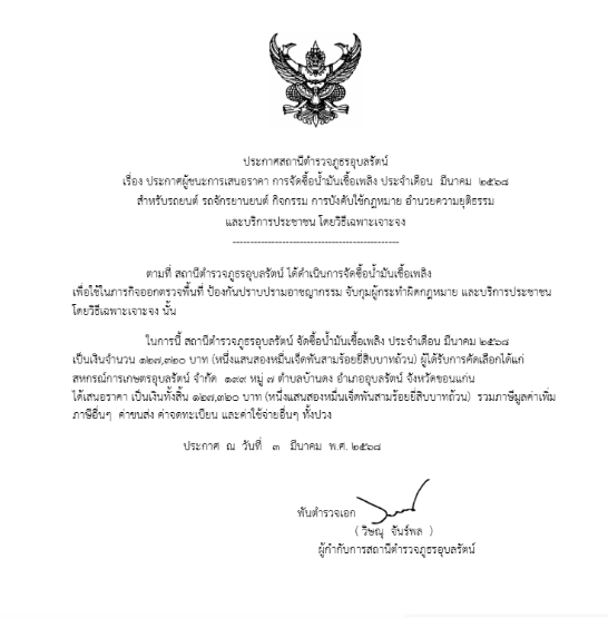 ประกาศผู้ชนะการเสนอราคาน้ำมันเชื้อเพลิง โดยวิธีเฉพาะเจาะจงเดือน มีนาคม 2568
