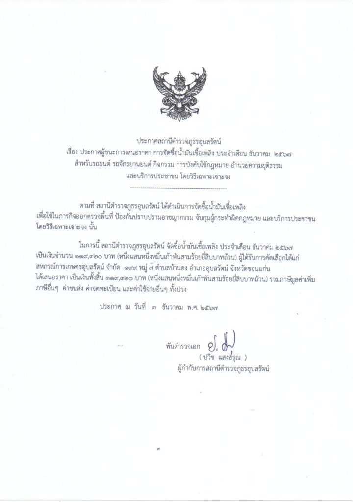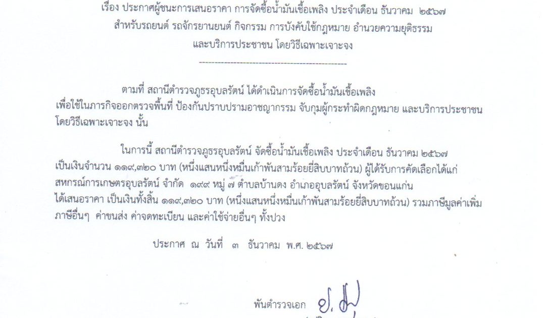 ประกาศผู้ชนะการเสนอราคาน้ำมันเชื้อเพลิง โดยวิธีเฉพาะเจาะจง