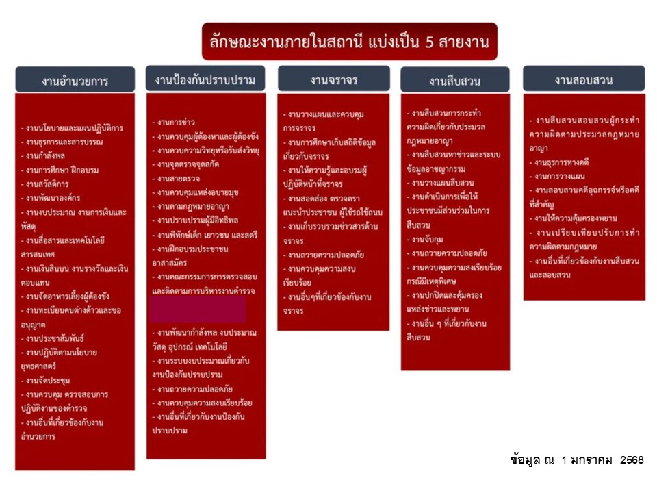 มีหน้าที่เกี่ยวกับการอำนวยการ การวางแผน การตรวจสอบติดตามและประเมินผลงานที่เกี่ยวกับนโยบาย ยุทธศาสตร์ และแผนงานของสถานีตำรวจ งานการบริหารบุคลากร งานจเรตำรวจงานกิจการพิเศษ งานความมั่นคง การศึกษา การฝึกอบรม งานวิชาการ สวัสดิการ การพัฒนา การบริหารจัดการ งบประมาณ การเงิน การพัสดุ การพลาธิการและสรรพาวุธ การส่งกำลังบำรุง รวมทั้งลักษณะงานอื่น ๆ ที่เกี่ยวข้องหรือเป็นส่วนประกอบของงานดังกล่าว เพื่อส่งเสริมหรือสนับสนุนการปฏิบัติงานของสถานีตำรวจ